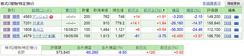 5/23木の日経平均は 132円安の21,151円と反落。 前日5/22のダウ平均は 100ドル安の25,776ドルと反落。 資産状況は という結果でした。 アンジェス(4563)ですが 32円安の670円でした。 大引け後のPTSでは 15円安の655円でした(23:59時点)。 機関の空売りです…