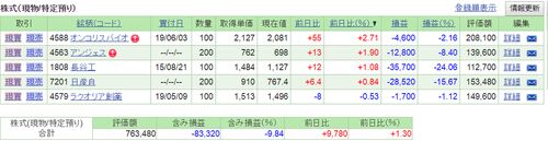 6/10月の日経平均は 249円高の21,134円と2日続伸。 前週末6/7のダウ平均は 263ドル高の25,983ドルと5日続伸。 資産状況は という結果でした。 アンジェス(4563)ですが 13円高の698円でした。 大引け後のPTSでは 4円高の702円でした(22:30時点)。 機関の空売…
