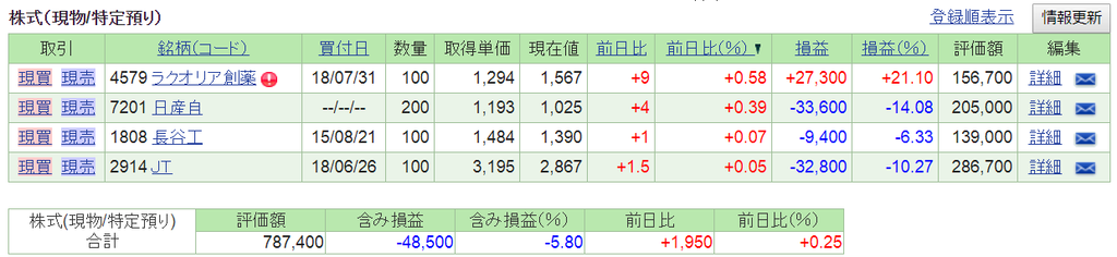 2018-09-10 2018.9.10(月) 資産状況 9/10月の日経平均は66円高の22,373円と7日ぶりに反発しました。 本日は資産状況のみ報告させていただきます。 保有株は小幅ながら上昇しました。 未保有ですが、 アドウェイズ(2489)は57円高の821円と大きく上昇しました。 以前損切りした銘柄なのですが、 再チャレンジするか迷っています笑 LINE(3938)も買いたいのですが資金が足りないです泣 もう少し様子見した方がいいのかなあ。 それでは。 にほんブログ お名前.com Amazonクーポン