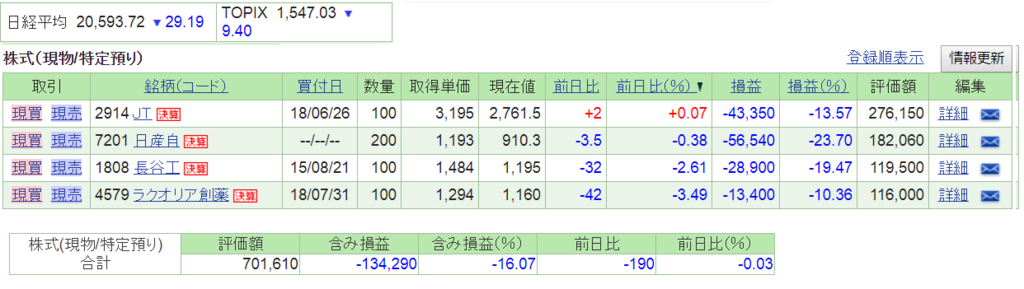 2019-01-23 2019.1.23(水) 資産状況 1/23水の日経平均は 29円安の20,593円と2日続落しました。 前日1/22のダウ平均は 301ドル安の24,404ドルと5日ぶりに反落しました。 米中貿易協議で知的財産権の件で 不透明感がでてきたことで売られる展開に。 この4日間で約800ドル上がってましたから その反動で利確もあったのかもです。 資産状況は という結果でした。 ラクオリア(4579)ですが 機関の空売りについて 1/21 ドイツ銀行 19,200株 空売り JPモルガン 80株 買い戻し 1/22 モルガンスタンレー 17,700株 空売り モルガンスタンレーは 5日間で145,300株の空売りです。 あとJPモルガンの買い戻し どういう意図があるんでしょうか。 それでは。