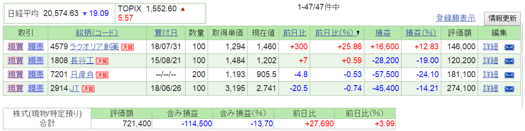 2019-01-25 2019.1.24(木) 資産状況 1/24木の日経平均は 19円安の20,574円と3日続落しました。 前日1/23のダウ平均は 171ドル高の24,575ドルと反発しました。 資産状況は という結果でした。 ラクオリア(4579)ですが 機関の空売りについて 1/23 モルガンスタンレー 27,600株 空売り という動きがありました。 これで6日連続、計172,900株の空売りです。 ここまで強気に来られるとちょっと心配になります ラクオリア(4579)はS高で終わりました。うれしいw ダウとドル円次第では明日の日経は上がりそうですが ラクオリアは利確されちゃうかなー それでは。 にほんブログ お名前.com Amazonクーポン